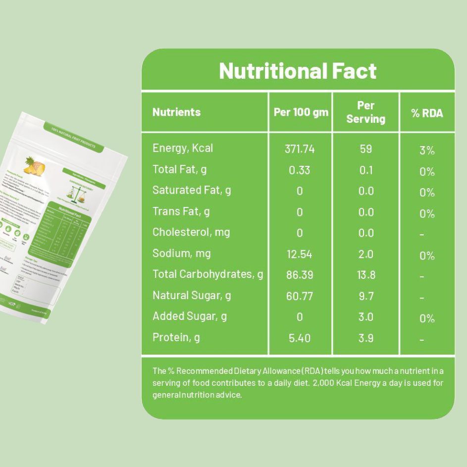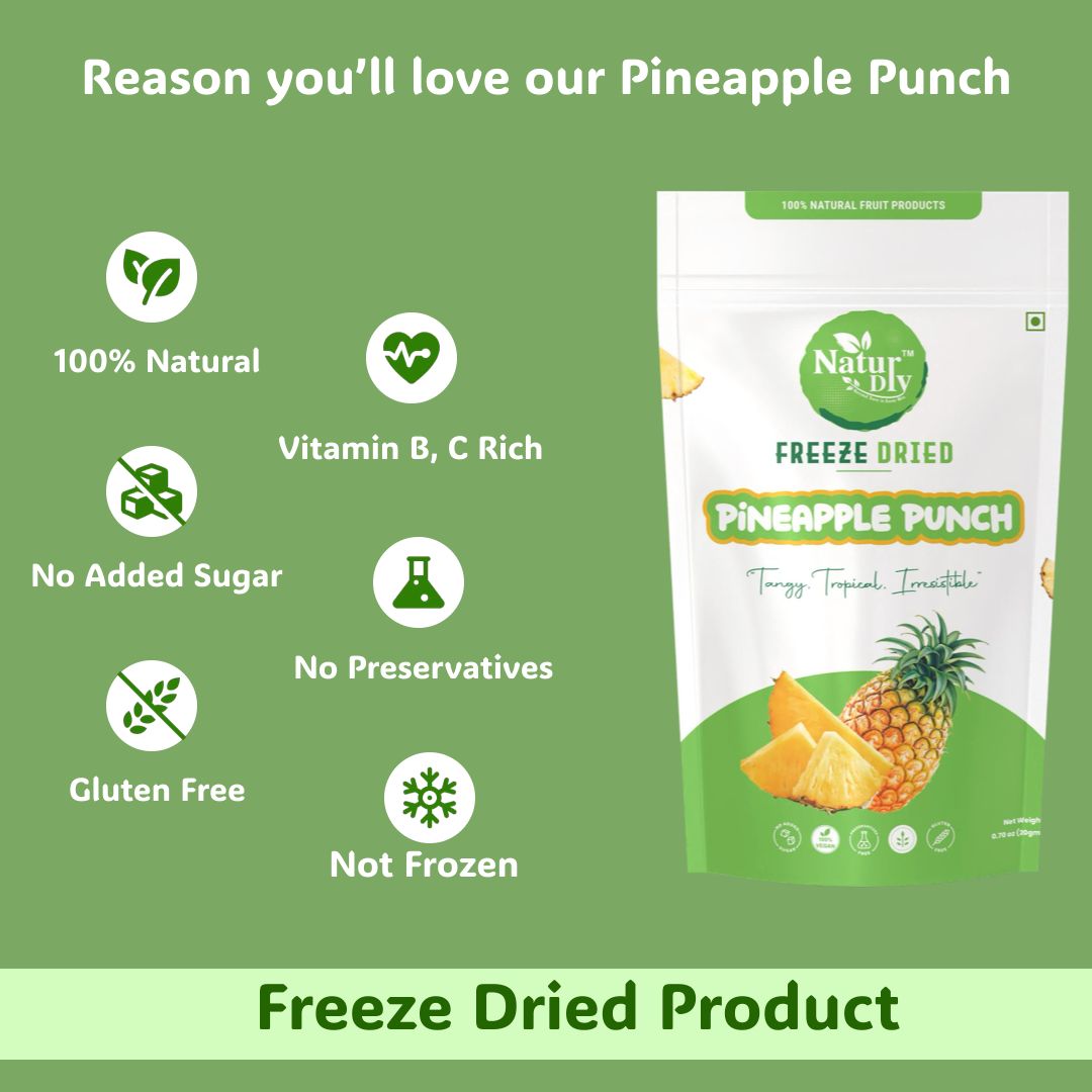 Pack of 1 Pack of 2 Pack of 3Enjoy the tropical taste of pineapple punch a healthy snack made from 100% real pineapple slices with no added sugar, preservatives, or artificial flavors. Light, crunchy, and bursting with natural sweetness, our pineapple punch is packed with vitamin C, antioxidants, and dietary fiber to support immunity, digestion, and overall wellness.